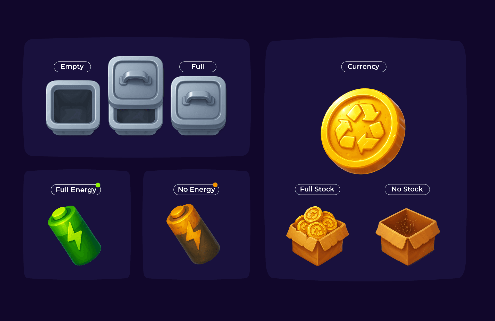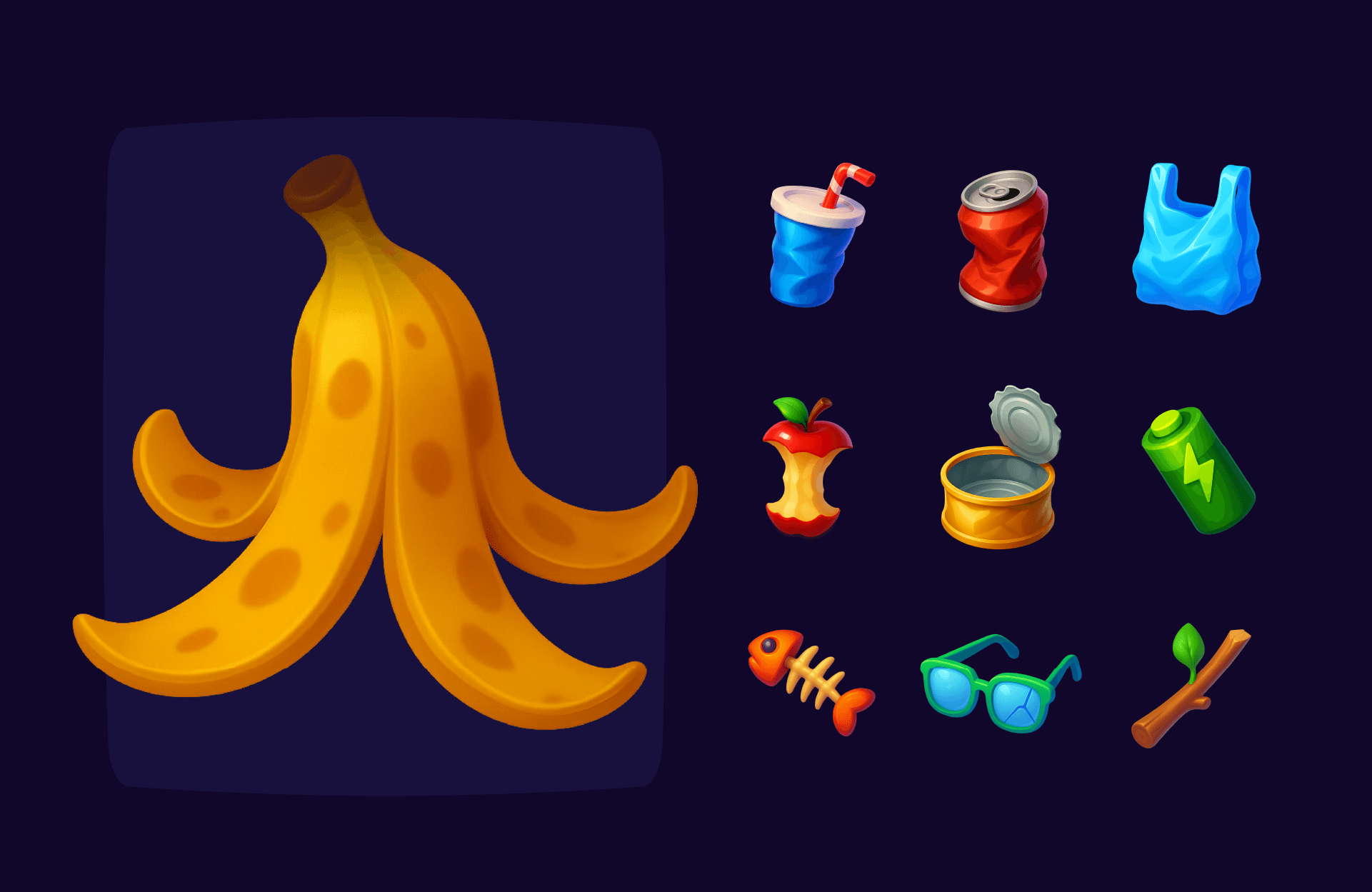 Illustrated assets for an educational recycling game made with AI collaboration.
